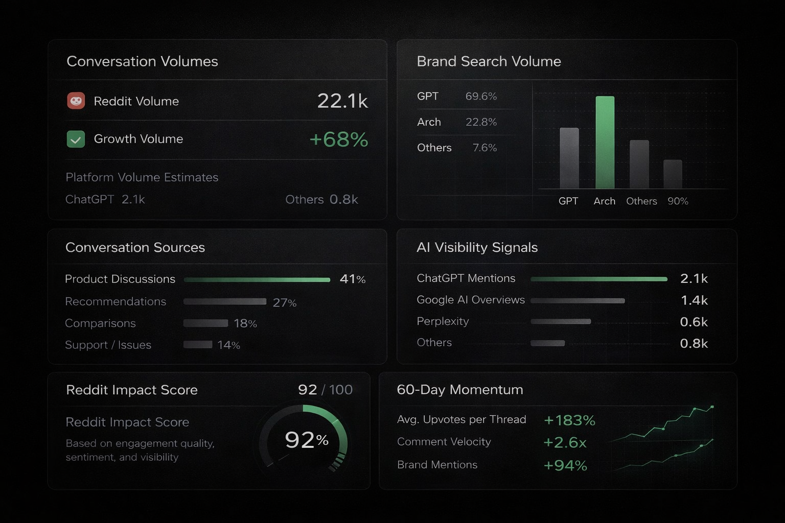 LLMs copy the internet's consensus. On Reddit, consensus is public: upvotes, comments, and repeat mentions. We build that footprint so when Al recommends "the best," it has a clear, trusted answer.